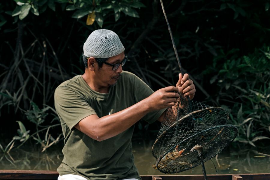 Mais, poursuit Mukhtar, un autre fléau est responsable de la destruction des mangroves survivantes au tsunami : la multiplication, depuis une dizaine d’années, de la création d’étangs d’aquaculture intensive. Sources de revenus immédiats pour les communautés, ces étangs artificiels, installés en lieu et place des forêts naturelles de mangroves, ne sont toutefois pas pérennes. Lorsque leur productivité décroît, ils sont abandonnés en l’état, et leurs eaux infiltrées d’antibiotiques contaminent tout l’écosystème environnant. « Alors que la mangrove, elle, est un refuge naturel pour de nombreuses espèces de crabes, mollusques, crustacés et poissons », explique Mukhtar. Grâce au projet financé par Reforest’Action, les villageois de Rantopanjang ont pris conscience de l’impact néfaste des étangs intensifs et s’engagent aujourd’hui pour la réintroduction de la mangrove et la création, en son sein, d’étangs organiques de sylvopêche qui valorisent la richesse naturelle de la mangrove en biodiversité. Convaincu que de telles pratiques de pêche durable seront plus bénéfiques à long terme pour la sécurité alimentaire du village et l’économie locale, Mukhtar se réjouit : « La production de poisson a augmenté de 30% en trois ans grâce à la restauration de la mangrove. Nous avons beaucoup à gagner en protégeant nos forêts. » Redonner des racines à l’océan – tel est le projet de Mukhtar pour nourrir la communauté, et permettre au village de retrouver son paysage d’antan.