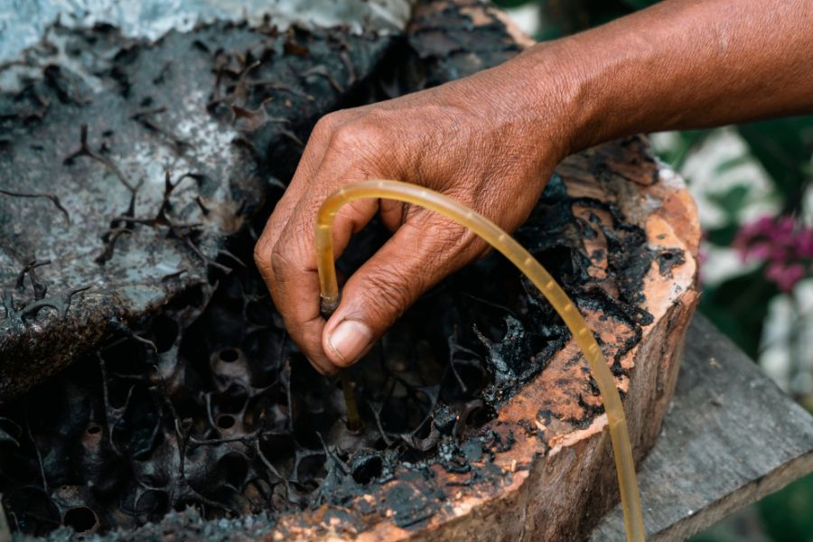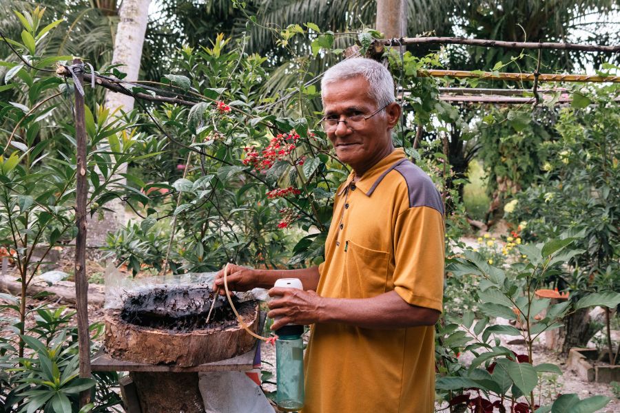 A une quarantaine de kilomètres plus au nord, le village de Lubuk Kertang détient également une histoire de résilience au cœur de la mangrove. Nous sommes accueillis par Zul, chef de village, et Ali, apiculteur, qui nous emmènent dans un petit jardin luxuriant et savamment aménagé. « Quand nous étions plus jeunes, le village était cerclé par la mangrove et regorgeait d’abeilles », racontent-ils. « Mais depuis 2006, presque toutes les forêts ont été converties en cultures de palmiers à huile, et les abeilles ont complètement disparu. » Profondément désorienté par la perte du paysage de son enfance, Zul décide de s’engager, en 2017, dans le projet de restauration de la mangrove conduit par Yagasu. En parallèle, il réfléchit à un moyen de faire revenir les abeilles perdues pour que sa communauté puisse bénéficier à nouveau de leur miel. En utilisant une souche morte de palétuvier, il crée les conditions pour qu’une ruche s’y établisse, et plante, aux portes de sa maison, un jardin riche en biodiversité végétale. Ali, l’apiculteur, se charge alors de recueillir une reine au sein de la mangrove voisine. Le reste de la colonie ne tarde pas à la suivre. Ainsi naît la première ruche de Lubuk Kertang depuis plus de quinze ans. Si, pour l’heure, le miel produit est issu des fleurs du jardin de Zul, l’ambition est bel et bien de transplanter cet écrin floral au sein de la mangrove régénérée à proximité du village. Parce que les palétuviers ne fleurissent qu’une ou deux fois par an, selon leur essence, les fleurs du jardin permettront aux abeilles de rester sédentaires et de ne pas aller chercher plus loin leur nectar, tout en pollinisant les fleurs d’Avicennia et de Rhizophora lorsqu’elles apparaissent, en février, en juin et en octobre. « La mangrove est source de vie », rappelle Zul, « mais aussi de revenus économiques pour nos communautés. » Aujourd’hui, le miel récolté par Ali est vendu au sein des petites échoppes de Lubuk Kertang. Demain, le village espère que les abeilles pourront retrouver un foyer durable au cœur de la mangrove.