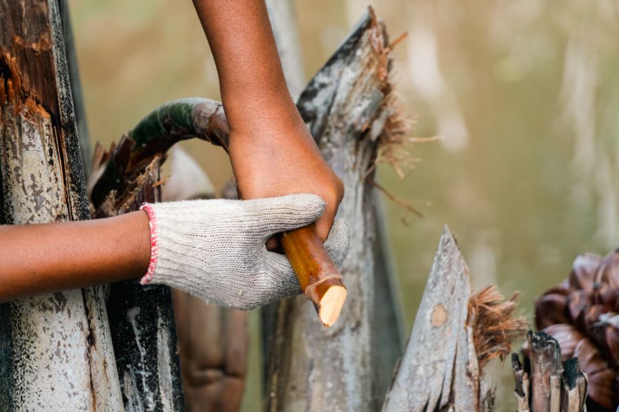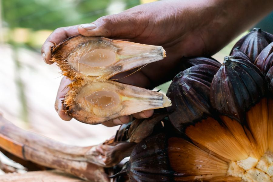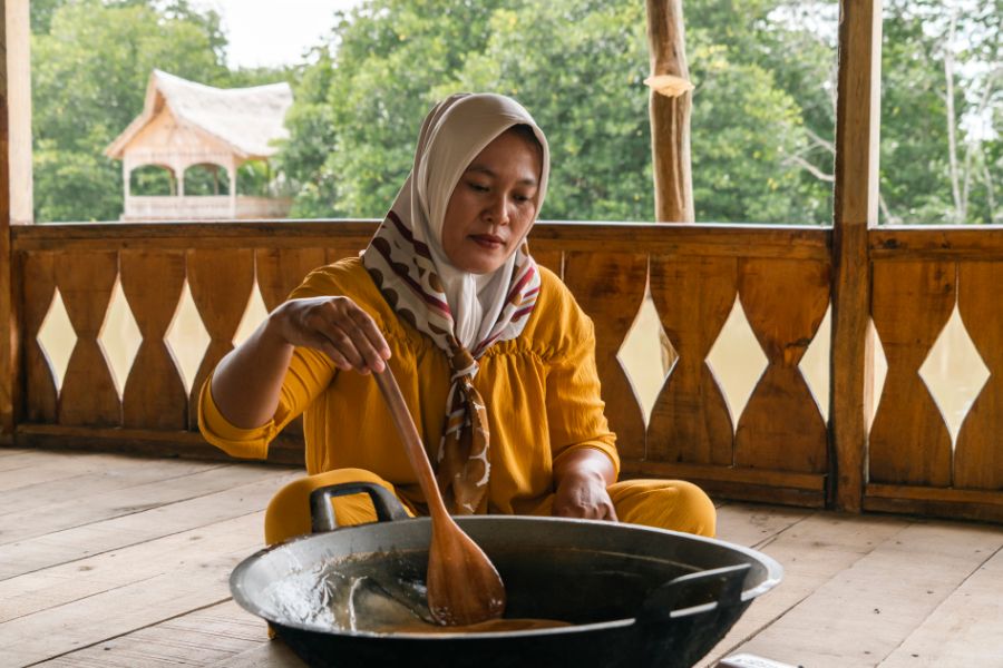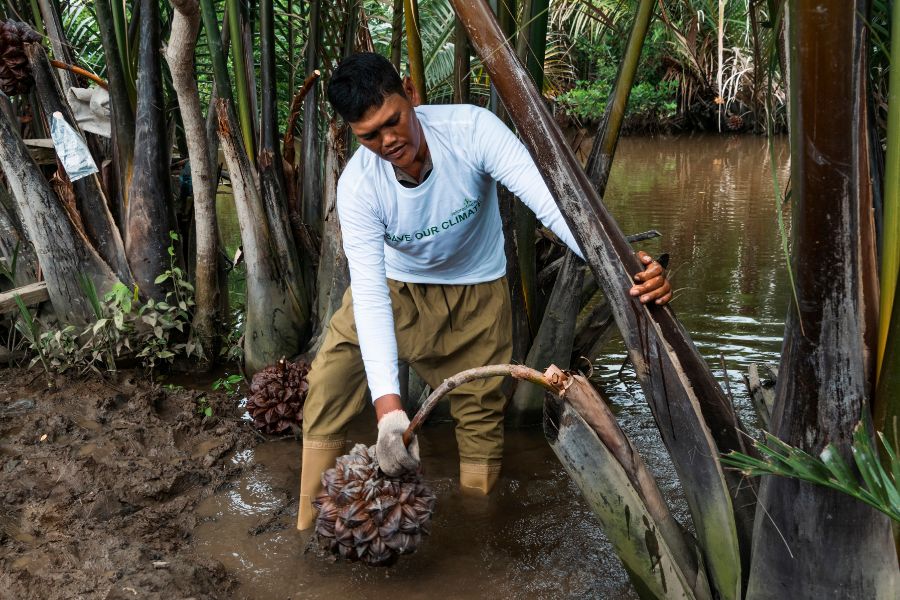 Présent naturellement au sein de la mangrove, en association avec les différentes espèces de palétuviers, le palmier nipa recèle une ressource méconnue que les habitants du village d’Abeuk Geulanteu ont découverte grâce au projet conduit par notre partenaire Yakopi. De coutume, ce palmier, qui est le seul de son espèce à pouvoir croître dans l’eau, était utilisé pour créer des toits en fibre végétale. Mais cette pratique exigeait la coupe complète de l’arbre, participant dès lors à la déforestation au sein des écosystèmes de mangrove. Dans l’optique de conserver l’intégrité des forêts, Yakopi réfléchit à une solution pour que les communautés locales continuent à intégrer le nipa à leur économie sans toutefois passer par la coupe des palmiers, précieux pour le maintien des sols vaseux qu’ils contribuent à fixer grâce à leurs racines. C’est ainsi que se répand, au sein des villages associés au projet, la production de sucre de palme, issu de la sève du nipa.