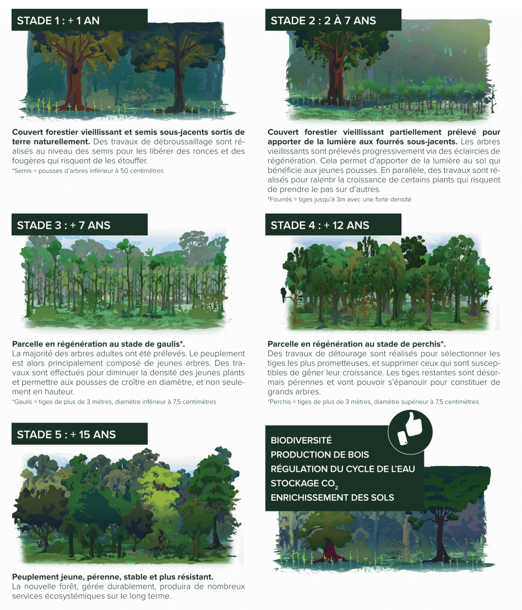 La RNA est une approche écoresponsable de la gestion forestière, qui permet la restauration et le renforcement des écosystèmes forestiers. D’une part, cette méthode permet d’éviter les coupes rases et les sols nus, de privilégier la régénération progressive de la forêt et donc de préserver la biodiversité et la fonction de stockage de carbone des sols tout au long du processus. D’autre part, elle permet de recréer de véritables forêts multifonctionnelles, qui sont sources de nombreux bénéfices au-delà du maintien de la biodiversité : production de bois, stockage du carbone, régulation du cycle de l’eau…